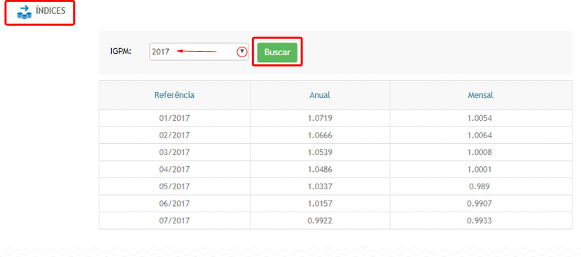 Na tele de índice, basta informar o "Ano" e em seguida clicar em "Buscar". O sistema exibirá uma lista contendo o percentual mensal do índice cadastrado.
