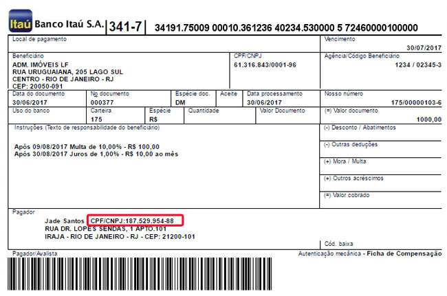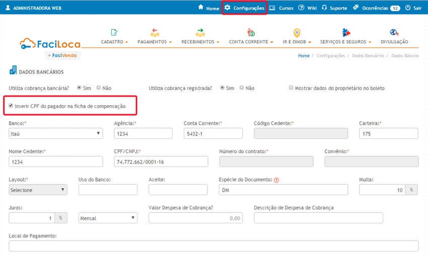 • Implementado o número de CPF do pagador na Ficha de compensação. Essa implementação pode ser configurada em Configurações > Dados de Cobrança > Dados Básicos, sendo seu uso opcional. Caso o usuário prefira, poderá desmarcar a opção para que o CPF do proprietário não seja exibido na Ficha de compensação.