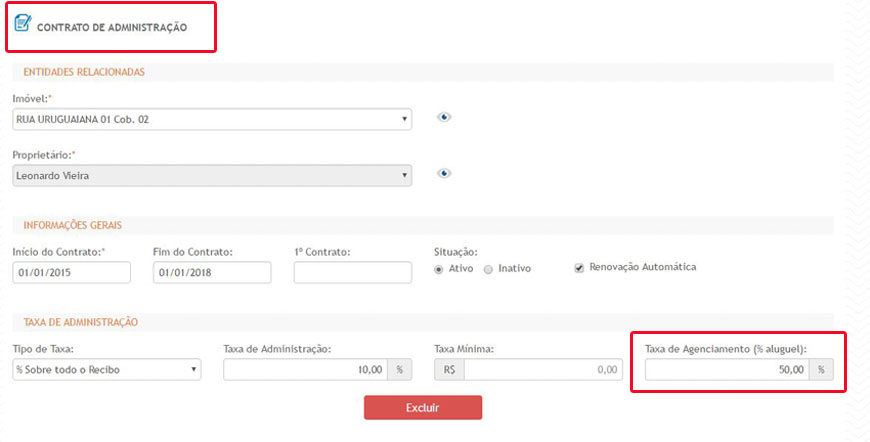 • Implementado o campo "Taxa de Agenciamento" no Contrato de Administração, com essa implementação a imobiliária e/ou Administradora poderá cobrar automaticamente a Taxa de Agenciamento, no primeiro boleto de aluguel.