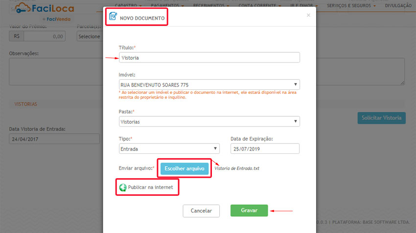 • Implementada a exibição dos "Dados de Vistoria" no contrato de locação. Com essa implementação o usuário poderá cadastrar datas de vistorias, anexar as vistorias no contrato de locação e solicitar valores de vistorias, através da opção Botãovistoria1.jpg.