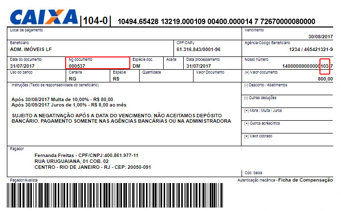 O Número do Documento permanece com o número do boleto gerado pelo sistema e o "Nosso Número será alterado para o novo sequencial cadastrado.