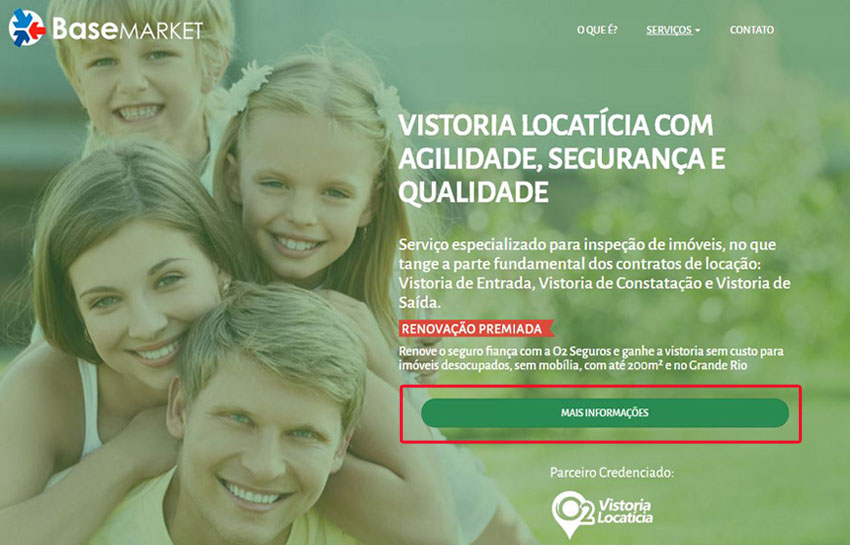 Após clicar sobre o botão Botãovistoria1.jpg haverá redirecionado para a site do Base Market , onde poderá obter simulações. Para obter informações sobre "Vistorias Locatícias", clicar em "Mais Informações".