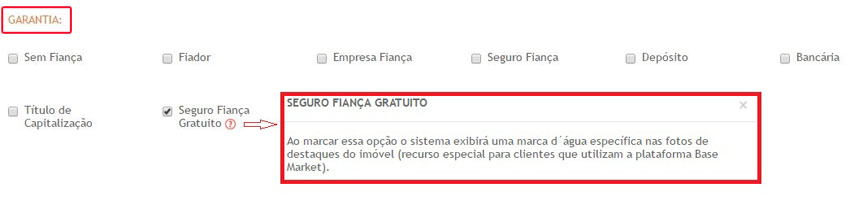 Basta acessar o Cadastro de Imóveis Comercializados que tenham como finalidade "Aluguel", em seguida marcar a opção "Seguro Fiança Gratuito". Acesso: Imóvel > Garantia