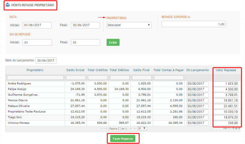 Nesta tela o usuário poderá filtrar por data, nome do proprietário , dia do repasse e ainda terá a possibilidade de informar um determinado valor, para que o sistema filtre apenas valores acima da informação inserida no campo "Superior á".