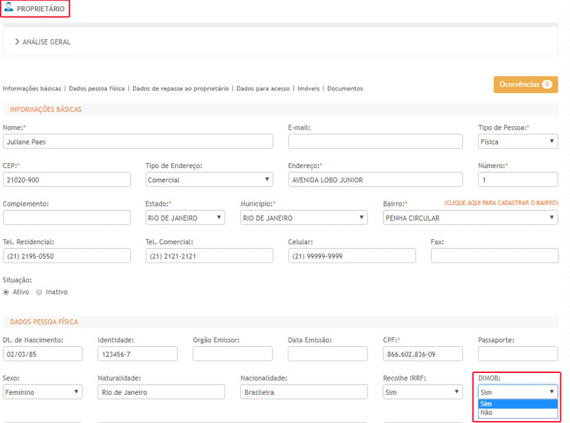 - Implementado o campo "Dimob", no cadastro de proprietário, com essa implementação o usuário poderá selecionar entre as opções SIM ou Não, os cadastros de "Proprietários" que serão enviados no arquivo Dimob para Receita Federal.