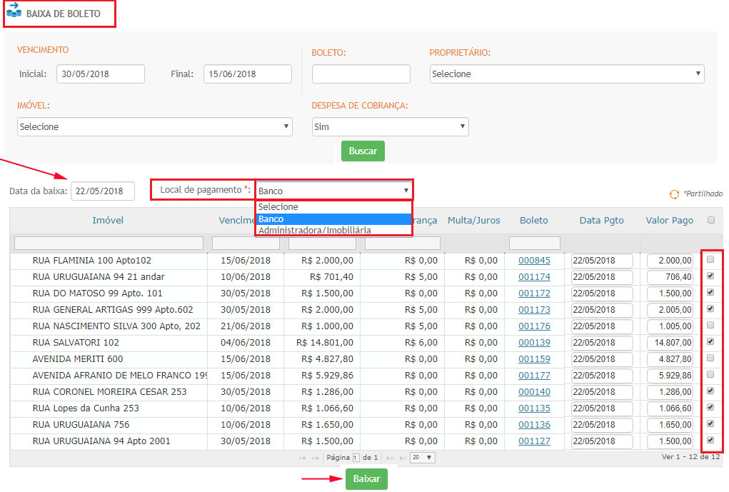 • Implementada a opção "Local de Pagamento" na "Baixa de Boletos" (Recebimentos > Operações > Baixar). Com essa implementação, a Administradora/Imobiliária irá informar qual o "Local de Pagamento", antes de baixar os boletos. Essa rotina possibilitará um controle maior nos Relatórios de Boletos Pagos.