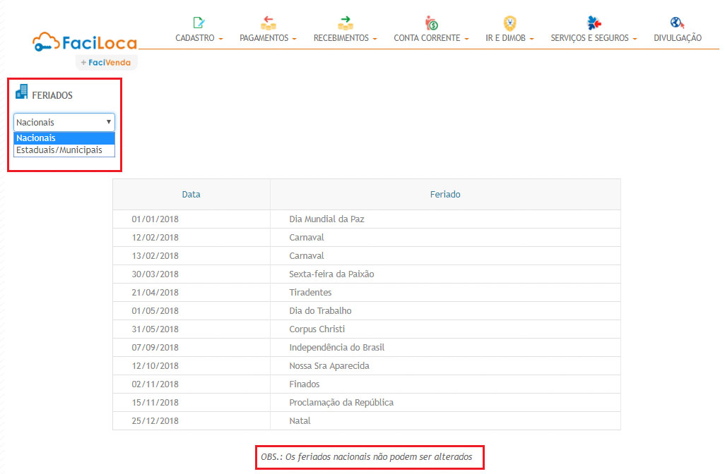 • Implementada "Tabela de Feriados" para cadastros e consultas em "Configurações > Dados De Cobrança > Feriados." Com essa implementação, caso o vencimento ocorra em alguma data que seja feriado, o FaciLoca, permitirá que o pagamento do boleto seja realizado no próximo dia útil sem cobrança de multa/juros.