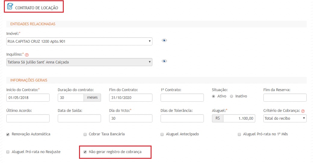 • Implementada a opção para não gerar "Registro de Cobrança", no Contrato de Locação (Cadastro > Contratos > Incluir Locação). Com essa implementação, o usuário poderá "Liberar e Baixar" boletos simples sem que haja necessidade de fazer o registro da cobrança na rede bancária.