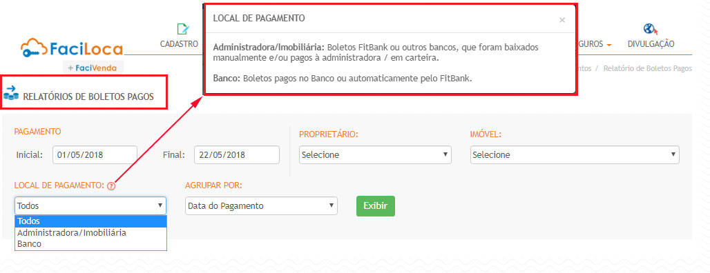 • Implementado o campo "Local de Pagamento" no "Relatório de Boletos Pagos" (Recebimentos > Relatórios > Boletos Pagos). Com essa implementação, o usuário poderá filtrar os boletos pagos na rede bancária e/ou na Administradora/Imobiliária.