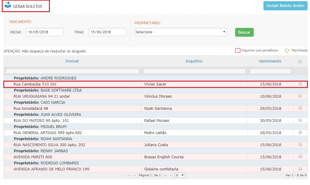 • Implementada em cor diferenciada, a sinalização "Inquilino com Pendência" na lista "Gerar Novos" (Recebimentos > Operações> Gerar Novos). Com essa implementação, o usuário saberá que existem boletos gerados que não foram baixados.