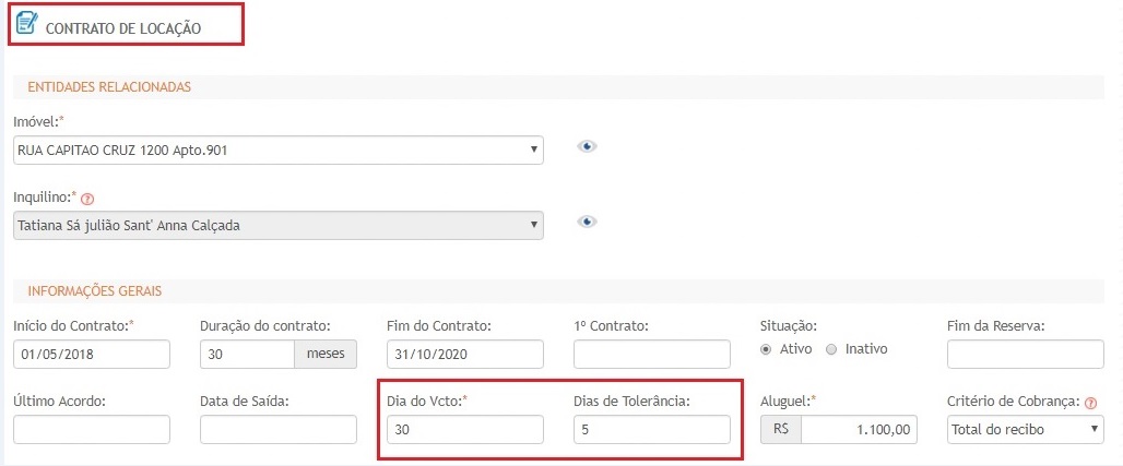 • Implementado o "Critério Cobrança" com a opção para calcular multa e juros "Somente sobre Aluguel" (Diferença de Aluguel e Desconto de Aluguel), no Contrato de Locação (Cadastro > Contratos > Incluir Locação).