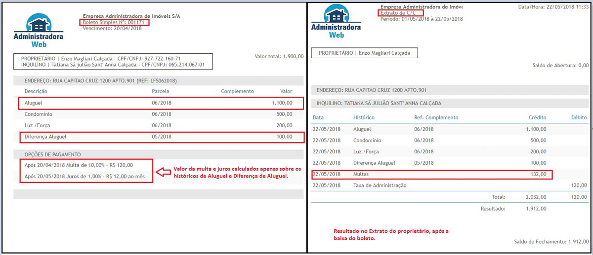 Abaixo, exemplos no boleto simples e no Extrato de conta corrente do proprietário.