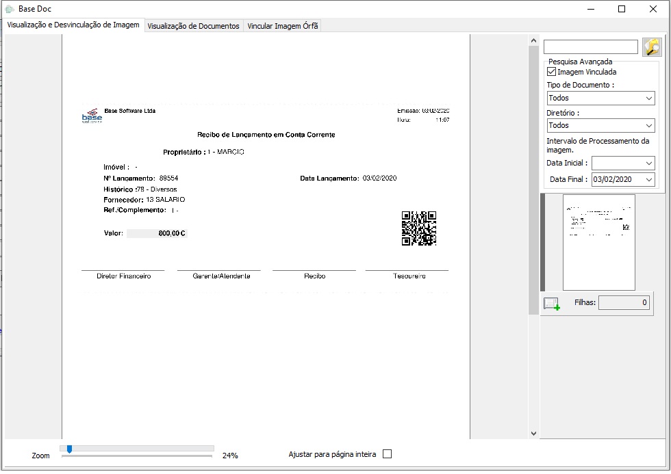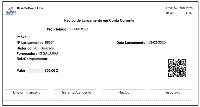 - Essa opção permite que os lançamentos de conta corrente, que não tenham Imagem BaseDoc vinculada, tenham recibos de entrada impressos com a identificação do QrCode e, assim, que imagem desses recibos sejam vinculadas ao respectivo lançamento.