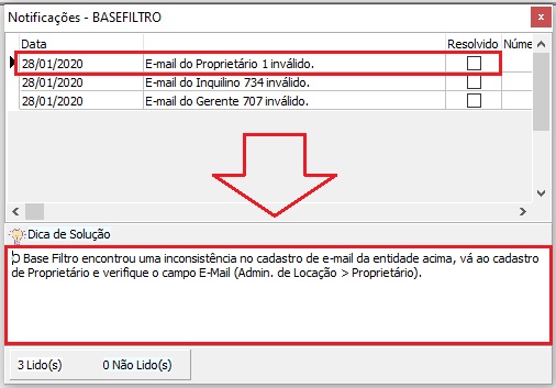 Os campos de E-mail que estiverem inconsistentes não serão mais enviados, até que sejam corrigidos. Do mesmo, jeito os alertas serão gerados a cada ciclo de execução do Base Filtro, mesmo que o alerta seja marcado como resolvido. Consulte também a documentação referente aos Alertas do Sistema. |