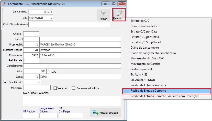 e escolher a opção Recibo de Entrada Corrente, o sistema irá fazer a impressão direta do recibo de acordo com o lançamento que estiver na tela.